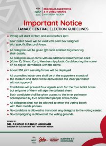 The National Democratic Congress (NDC) has released comprehensive guidelines to regulate the Tamale Central parliamentary primary tomorrow, promising a disciplined and credible process for delegates and candidates alike.