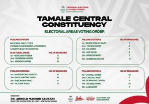 The polling arrangements have also been carefully structured. Polling Station 1 will serve regional and constituency executives, alongside branches from Agric Mohiyebihi, Gumbihini North, and Aboaboo Ward. Polling Station 2 will accommodate Moshi-Zongo, Tishigu, Salamba, ADB, Warizihi, and Gumbihini South. Polling Station 3 is assigned to Dakpemfong, Buglanfong, Sabonjida, and Victory Wards, while Polling Station 4 will cater for Changli, Choggu West, Dohinaayili, Zogbeli, and Lamacara.