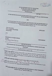 The petitioner, Toh You Kang lodged the suit at the Human Rights Division of the High Court in Accra, claiming that Ashie-Moore orchestrated a scheme that led to his unlawful detention, financial loss, and the seizure of his property.