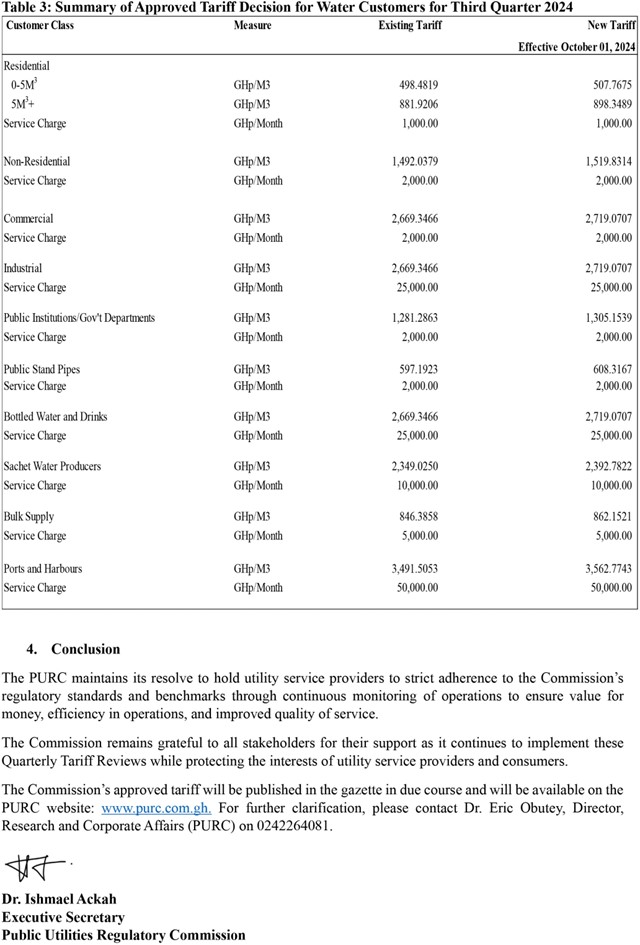 The 3.02% increase in electricity tariffs for the Electricity Company of Ghana (ECG) and the 1.86% rise in water tariffs for the third quarter of 2024, approved by the Public Utilities Regulatory Commission (PURC), takes effect from today, October 1, 2024.