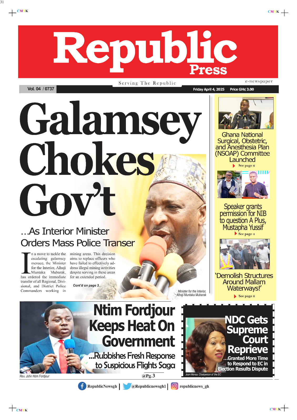 Headlines of major news items, as captured on the front pages of newspapers. <a href="https://myrepubliconline.com/newspaper-headlines-friday-april-04-2025/img-20250404-wa0004/" rel="attachment wp-att-112066"><img class="alignnone size-full wp-image-112066" src="https://myrepubliconline.com/wp-content/uploads/2025/04/IMG-20250404-WA0004.jpg" alt="" width="1130" height="1600" /></a> <a href="https://myrepubliconline.com/wp-content/uploads/2025/04/RP-A4.pdf" target="_blank" rel="noopener"><strong>READ FULL PUBLICATION HERE</strong></a> <a href="https://myrepubliconline.com/newspaper-headlines-friday-april-04-2025/grap-9/" rel="attachment wp-att-112046"><img class="alignnone size-full wp-image-112046" src="https://myrepubliconline.com/wp-content/uploads/2025/04/Grap.jpg" alt="" width="1000" height="1318" /></a> <a href="https://myrepubliconline.com/newspaper-headlines-friday-april-04-2025/times-32/" rel="attachment wp-att-112052"><img class="alignnone size-full wp-image-112052" src="https://myrepubliconline.com/wp-content/uploads/2025/04/times.jpg" alt="" width="430" height="573" /></a> <a href="https://myrepubliconline.com/newspaper-headlines-friday-april-04-2025/guide-34/" rel="attachment wp-att-112047"><img class="alignnone size-full wp-image-112047" src="https://myrepubliconline.com/wp-content/uploads/2025/04/Guide-1.jpg" alt="" width="483" height="648" /></a> <a href="https://myrepubliconline.com/newspaper-headlines-friday-april-04-2025/analyst-friday-8/" rel="attachment wp-att-112041"><img class="alignnone size-full wp-image-112041" src="https://myrepubliconline.com/wp-content/uploads/2025/04/Analyst-Friday.jpg" alt="" width="778" height="1056" /></a><a href="https://myrepubliconline.com/newspaper-headlines-friday-april-04-2025/gist/" rel="attachment wp-att-112060"><img class="alignnone size-full wp-image-112060" src="https://myrepubliconline.com/wp-content/uploads/2025/04/gist.jpeg" alt="" width="795" height="1080" /></a><a href="https://myrepubliconline.com/newspaper-headlines-friday-april-04-2025/bft-38/" rel="attachment wp-att-112061"><img class="alignnone size-full wp-image-112061" src="https://myrepubliconline.com/wp-content/uploads/2025/04/bft-1.jpeg" alt="" width="771" height="1080" /></a> <a href="https://myrepubliconline.com/newspaper-headlines-friday-april-04-2025/search-14/" rel="attachment wp-att-112051"><img class="alignnone size-full wp-image-112051" src="https://myrepubliconline.com/wp-content/uploads/2025/04/search-1.jpg" alt="" width="822" height="1080" /></a> <a href="https://myrepubliconline.com/newspaper-headlines-friday-april-04-2025/crusading-31/" rel="attachment wp-att-112043"><img class="alignnone size-full wp-image-112043" src="https://myrepubliconline.com/wp-content/uploads/2025/04/crusading.jpg" alt="" width="472" height="648" /></a> <a href="https://myrepubliconline.com/newspaper-headlines-friday-april-04-2025/custo-2/" rel="attachment wp-att-112044"><img class="alignnone size-full wp-image-112044" src="https://myrepubliconline.com/wp-content/uploads/2025/04/custo.jpg" alt="" width="520" height="648" /></a> <a href="https://myrepubliconline.com/newspaper-headlines-friday-april-04-2025/dem-2/" rel="attachment wp-att-112045"><img class="alignnone size-full wp-image-112045" src="https://myrepubliconline.com/wp-content/uploads/2025/04/dem-1.jpeg" alt="" width="720" height="837" /></a> <a href="https://myrepubliconline.com/newspaper-headlines-friday-april-04-2025/informer-34/" rel="attachment wp-att-112048"><img class="alignnone size-full wp-image-112048" src="https://myrepubliconline.com/wp-content/uploads/2025/04/Informer-1.jpg" alt="" width="958" height="1280" /></a> <a href="https://myrepubliconline.com/newspaper-headlines-friday-april-04-2025/publisher-20/" rel="attachment wp-att-112049"><img class="alignnone size-full wp-image-112049" src="https://myrepubliconline.com/wp-content/uploads/2025/04/publisher.jpg" alt="" width="484" height="648" /></a> <a href="https://myrepubliconline.com/newspaper-headlines-friday-april-04-2025/centa-3/" rel="attachment wp-att-112042"><img class="alignnone size-full wp-image-112042" src="https://myrepubliconline.com/wp-content/uploads/2025/04/centa.jpg" alt="" width="484" height="648" /></a> <a href="https://myrepubliconline.com/newspaper-headlines-friday-april-04-2025/voice-17/" rel="attachment wp-att-112053"><img class="alignnone size-full wp-image-112053" src="https://myrepubliconline.com/wp-content/uploads/2025/04/voice.jpg" alt="" width="1134" height="1600" /></a>