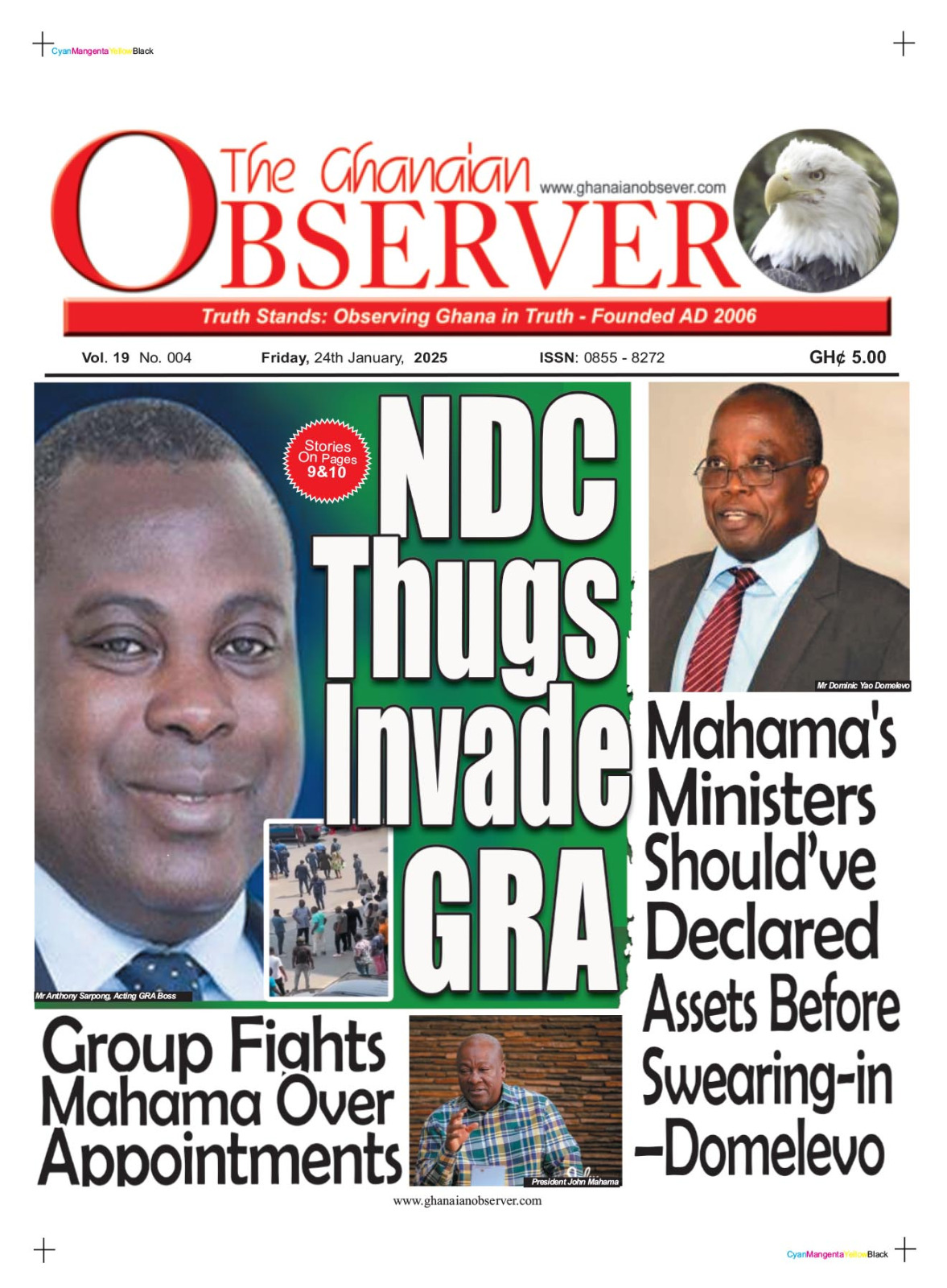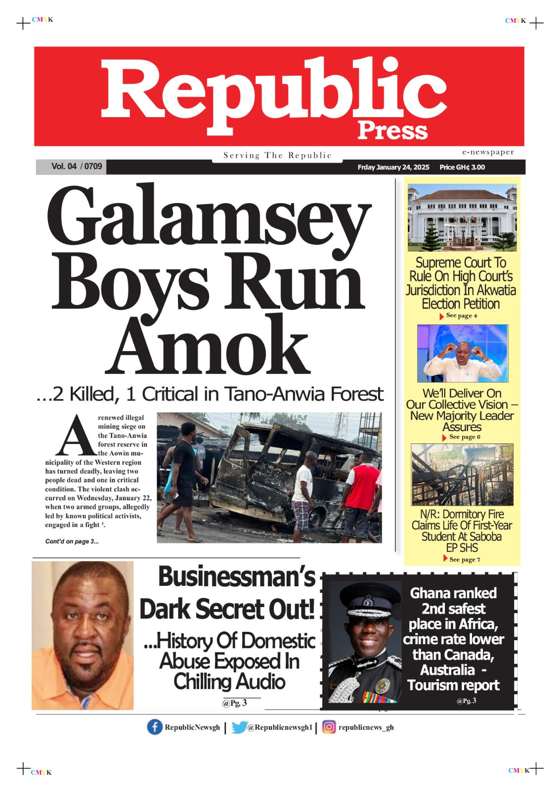 Headlines of major news items, as captured on the front pages of newspapers. <a href="https://myrepubliconline.com/newspaper-headlines-friday-january-24-2025/gaal/" rel="attachment wp-att-107284"><img class="alignnone size-full wp-image-107284" src="https://myrepubliconline.com/wp-content/uploads/2025/01/gaal.jpg" alt="" width="1133" height="1600" /></a> <a href="https://myrepubliconline.com/newspaper-headlines-friday-january-24-2025/grap-5/" rel="attachment wp-att-107285"><img class="alignnone size-full wp-image-107285" src="https://myrepubliconline.com/wp-content/uploads/2025/01/grap-1.jpg" alt="" width="1000" height="1318" /></a><a href="https://myrepubliconline.com/newspaper-headlines-friday-january-24-2025/bft-8/" rel="attachment wp-att-107304"><img class="alignnone size-full wp-image-107304" src="https://myrepubliconline.com/wp-content/uploads/2025/01/bft-1.jpg" alt="" width="785" height="1080" /></a><a href="https://myrepubliconline.com/newspaper-headlines-friday-january-24-2025/voice-2/" rel="attachment wp-att-107306"><img class="alignnone size-full wp-image-107306" src="https://myrepubliconline.com/wp-content/uploads/2025/01/voice.jpg" alt="" width="1152" height="1600" /></a><a href="https://myrepubliconline.com/newspaper-headlines-friday-january-24-2025/img-20250124-wa0022/" rel="attachment wp-att-107308"><img class="alignnone size-full wp-image-107308" src="https://myrepubliconline.com/wp-content/uploads/2025/01/IMG-20250124-WA0022.jpg" alt="" width="1177" height="1600" /></a><a href="https://myrepubliconline.com/newspaper-headlines-friday-january-24-2025/img-20250123-wa0062/" rel="attachment wp-att-107309"><img class="alignnone size-full wp-image-107309" src="https://myrepubliconline.com/wp-content/uploads/2025/01/IMG-20250123-WA0062.jpg" alt="" width="763" height="1080" /></a><a href="https://myrepubliconline.com/newspaper-headlines-friday-january-24-2025/analyst-friday-2-4/" rel="attachment wp-att-107316"><img class="alignnone size-full wp-image-107316" src="https://myrepubliconline.com/wp-content/uploads/2025/01/Analyst-Friday-2.jpg" alt="" width="778" height="1056" /></a><a href="https://myrepubliconline.com/newspaper-headlines-friday-january-24-2025/sefwi-2/" rel="attachment wp-att-107317"><img class="alignnone size-full wp-image-107317" src="https://myrepubliconline.com/wp-content/uploads/2025/01/Sefwi.jpg" alt="" width="918" height="1280" /></a><a href="https://myrepubliconline.com/newspaper-headlines-friday-january-24-2025/img-20250123-wa0429-1/" rel="attachment wp-att-107318"><img class="alignnone size-full wp-image-107318" src="https://myrepubliconline.com/wp-content/uploads/2025/01/IMG-20250123-WA0429-1.jpg" alt="" width="822" height="1080" /></a><a href="https://myrepubliconline.com/newspaper-headlines-friday-january-24-2025/img-20250124-wa0010/" rel="attachment wp-att-107320"><img class="alignnone size-full wp-image-107320" src="https://myrepubliconline.com/wp-content/uploads/2025/01/IMG-20250124-WA0010.jpg" alt="" width="839" height="1080" /></a><a href="https://myrepubliconline.com/newspaper-headlines-friday-january-24-2025/img-20250124-wa0009/" rel="attachment wp-att-107321"><img class="alignnone size-full wp-image-107321" src="https://myrepubliconline.com/wp-content/uploads/2025/01/IMG-20250124-WA0009.jpg" alt="" width="900" height="1280" /></a><a href="https://myrepubliconline.com/newspaper-headlines-friday-january-24-2025/trust2664685889304312198/" rel="attachment wp-att-107323"><img class="alignnone size-full wp-image-107323" src="https://myrepubliconline.com/wp-content/uploads/2025/01/trust2664685889304312198.jpg" alt="" width="747" height="864" /></a><a href="https://myrepubliconline.com/newspaper-headlines-friday-january-24-2025/despatch4945843862409488832/" rel="attachment wp-att-107324"><img class="alignnone size-full wp-image-107324" src="https://myrepubliconline.com/wp-content/uploads/2025/01/despatch4945843862409488832.jpg" alt="" width="696" height="864" /></a><a href="https://myrepubliconline.com/newspaper-headlines-friday-january-24-2025/chronicle6358846824499085527/" rel="attachment wp-att-107325"><img class="alignnone size-full wp-image-107325" src="https://myrepubliconline.com/wp-content/uploads/2025/01/chronicle6358846824499085527.jpg" alt="" width="747" height="960" /></a><a href="https://myrepubliconline.com/newspaper-headlines-friday-january-24-2025/img-20250124-wa0010-2/" rel="attachment wp-att-107326"><img class="alignnone size-full wp-image-107326" src="https://myrepubliconline.com/wp-content/uploads/2025/01/IMG-20250124-WA0010-1.jpg" alt="" width="839" height="1080" /></a>