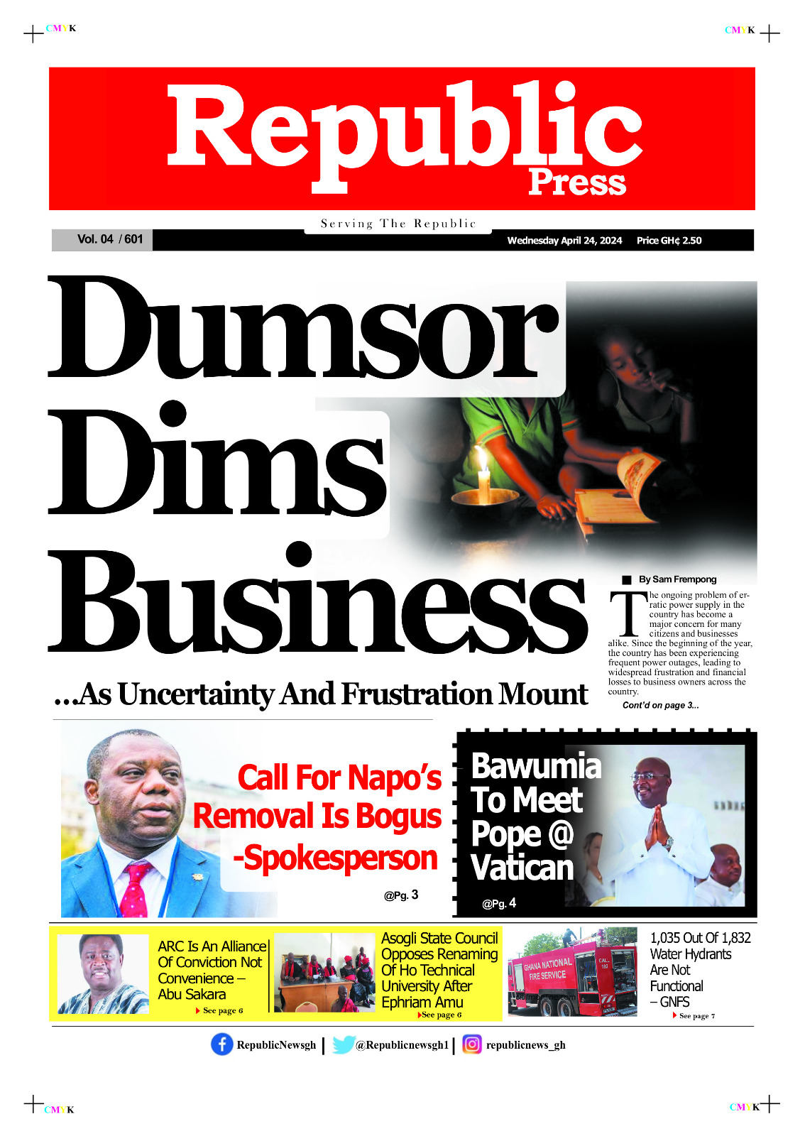 Headlines of major news items, as captured on the front pages of newspapers.<img class="alignnone size-full wp-image-88258" src="https://myrepubliconline.com/wp-content/uploads/2024/04/9519AFA0-1BB8-44A1-9EC5-D77CEFA8C270.jpeg" alt="" width="1134" height="1600" /><img class="alignnone size-full wp-image-88260" src="https://myrepubliconline.com/wp-content/uploads/2024/04/FDCF5B2A-0066-4DA4-92A7-EFB1D18888EA.jpeg" alt="" width="1154" height="1522" /> <img class="alignnone size-jnews750x375 wp-image-88261" src="https://myrepubliconline.com/wp-content/uploads/2024/04/18DEDDA0-1653-405B-8F25-B0FC20C4E2A2.jpeg" alt="" width="696" height="965" /><img class="alignnone size-full wp-image-88266" src="https://myrepubliconline.com/wp-content/uploads/2024/04/50EB68F0-F895-48C0-861C-6AE307D51046.jpeg" alt="" width="715" height="942" /> <img class="alignnone size-jnews750x375 wp-image-88267" src="https://myrepubliconline.com/wp-content/uploads/2024/04/8891FC34-246D-4D6B-8556-0E3D0C1E2DF3.jpeg" alt="" width="1247" height="1600" /><img class="alignnone size-full wp-image-88263" src="https://myrepubliconline.com/wp-content/uploads/2024/04/33C8E836-9C85-410F-A9F2-48BF9C9E9145-scaled.jpeg" alt="" width="1809" height="2560" /><img class="alignnone size-full wp-image-88264" src="https://myrepubliconline.com/wp-content/uploads/2024/04/1CDDB754-F83F-4BDE-AB41-14353B710D7E-scaled.jpeg" alt="" width="1897" height="2560" />