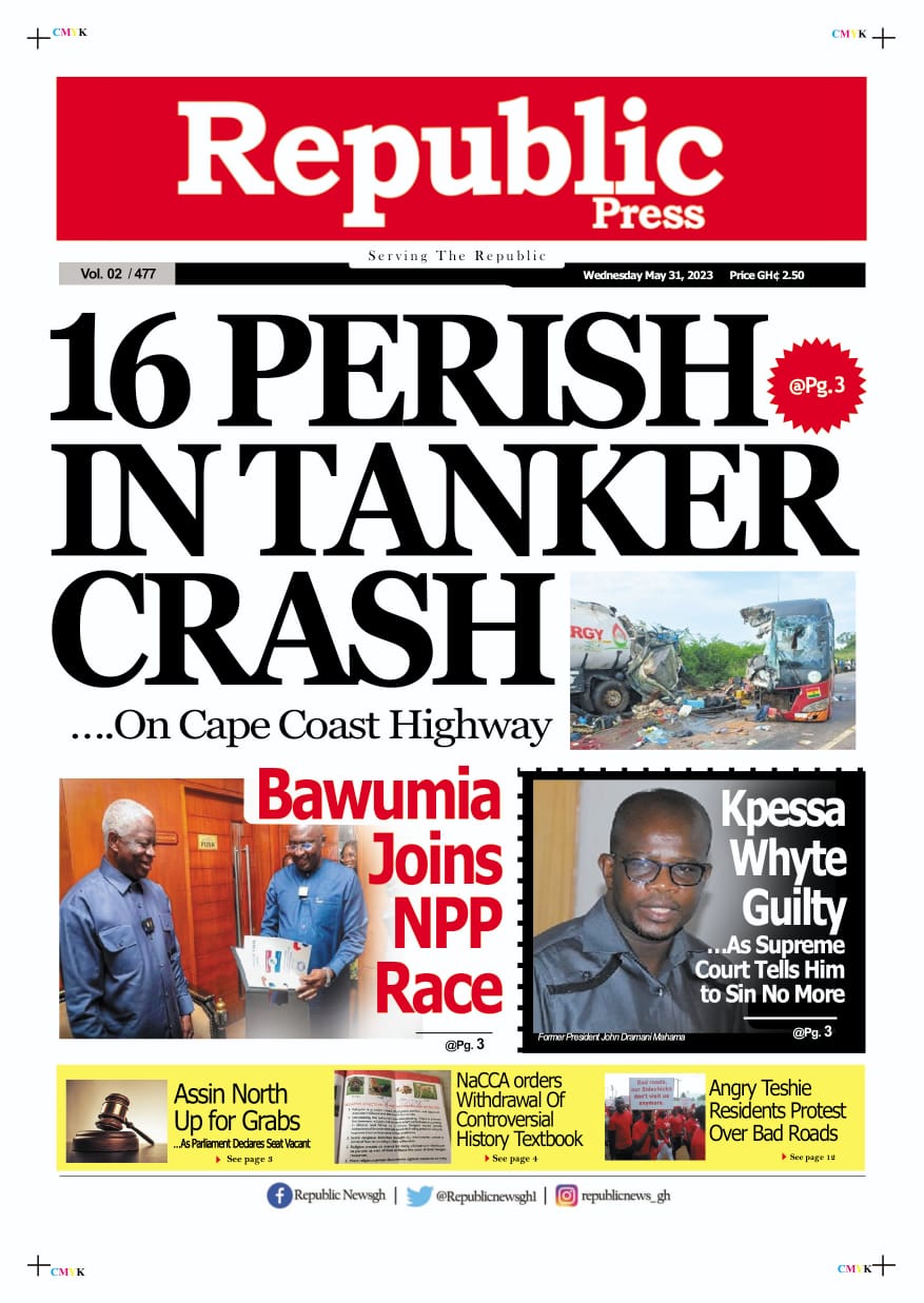 Headlines of major news items, as captured on the front pages of new newspapers. <img class="alignnone size-jnews750x375 wp-image-59792" src="https://myrepubliconline.com/wp-content/uploads/2023/05/67CF35A1-DE3B-42EF-BF69-702ECEBEF25C.jpeg" alt="" width="877" height="1237" /> <img class="alignnone size-jnews750x375 wp-image-59793" src="https://myrepubliconline.com/wp-content/uploads/2023/05/E42651CF-8A92-4C98-BC6D-0A847A7BE9E7.webp" alt="" width="750" height="933" /> <img class="alignnone size-jnews750x375 wp-image-59794" src="https://myrepubliconline.com/wp-content/uploads/2023/05/BF65A712-19E0-411A-BD20-90015CF4164C.webp" alt="" width="750" height="1003" /> <img class="alignnone size-jnews750x375 wp-image-59795" src="https://myrepubliconline.com/wp-content/uploads/2023/05/F0E74E93-F4D6-417C-AE6F-D5EC30B06F6E.webp" alt="" width="750" height="900" /> <img class="alignnone size-jnews750x375 wp-image-59796" src="https://myrepubliconline.com/wp-content/uploads/2023/05/F7F50A18-E0A1-46E5-8C02-77E610901308.webp" alt="" width="750" height="930" /> <img class="alignnone size-jnews750x375 wp-image-59797" src="https://myrepubliconline.com/wp-content/uploads/2023/05/8638EB7B-1AD2-4776-9440-16F22AA45007.webp" alt="" width="750" height="1003" /> <img class="alignnone size-jnews750x375 wp-image-59798" src="https://myrepubliconline.com/wp-content/uploads/2023/05/3034FC52-7FD5-4BC6-BD51-33AD080245D4.webp" alt="" width="720" height="887" /> <img class="alignnone size-jnews750x375 wp-image-59799" src="https://myrepubliconline.com/wp-content/uploads/2023/05/BF6AFF19-E6EC-444D-A44F-2D69A67C447B.webp" alt="" width="750" height="954" /> <img class="alignnone size-jnews750x375 wp-image-59800" src="https://myrepubliconline.com/wp-content/uploads/2023/05/754DCFE3-6508-4646-875E-6F71F1F26914.webp" alt="" width="750" height="1003" />