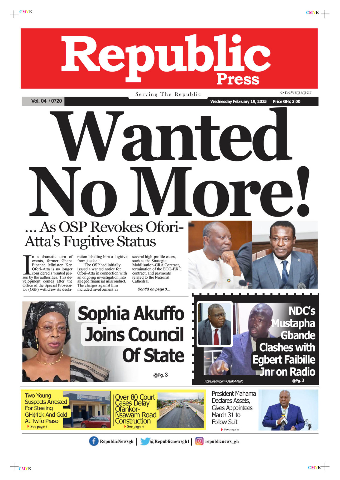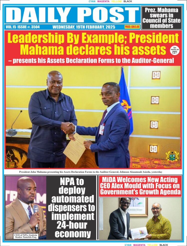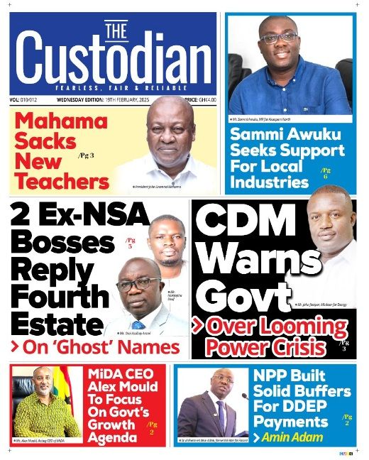 Headlines of major news items, as captured on the front pages of newspapers. <a href="https://myrepubliconline.com/newspaper-headlines-wednesday-february-19-2025/7ea2f08f-656d-4483-84a9-4c60f5b9d4a5/" rel="attachment wp-att-108993"><img class="alignnone size-full wp-image-108993" src="https://myrepubliconline.com/wp-content/uploads/2025/02/7ea2f08f-656d-4483-84a9-4c60f5b9d4a5.jpg" alt="" width="1134" height="1600" /></a> <a href="https://myrepubliconline.com/newspaper-headlines-wednesday-february-19-2025/graphic-57/" rel="attachment wp-att-108989"><img class="alignnone size-full wp-image-108989" src="https://myrepubliconline.com/wp-content/uploads/2025/02/graphic-5.jpg" alt="" width="1000" height="1318" /></a><a href="https://myrepubliconline.com/newspaper-headlines-wednesday-february-19-2025/accra-time/" rel="attachment wp-att-108996"><img class="alignnone size-full wp-image-108996" src="https://myrepubliconline.com/wp-content/uploads/2025/02/Accra-Time.jpg" alt="" width="520" height="648" /></a><a href="https://myrepubliconline.com/newspaper-headlines-wednesday-february-19-2025/analyst-28/" rel="attachment wp-att-108997"><img class="alignnone size-full wp-image-108997" src="https://myrepubliconline.com/wp-content/uploads/2025/02/Analyst-1.jpg" alt="" width="942" height="1280" /></a><a href="https://myrepubliconline.com/newspaper-headlines-wednesday-february-19-2025/centa/" rel="attachment wp-att-108998"><img class="alignnone size-full wp-image-108998" src="https://myrepubliconline.com/wp-content/uploads/2025/02/Centa.jpg" alt="" width="484" height="648" /></a><a href="https://myrepubliconline.com/newspaper-headlines-wednesday-february-19-2025/crusading-29/" rel="attachment wp-att-108999"><img class="alignnone size-full wp-image-108999" src="https://myrepubliconline.com/wp-content/uploads/2025/02/Crusading.jpg" alt="" width="538" height="648" /></a><a href="https://myrepubliconline.com/newspaper-headlines-wednesday-february-19-2025/custodian7558478213903661170/" rel="attachment wp-att-109000"><img class="alignnone size-full wp-image-109000" src="https://myrepubliconline.com/wp-content/uploads/2025/02/custodian7558478213903661170.jpg" alt="" width="520" height="648" /></a><a href="https://myrepubliconline.com/newspaper-headlines-wednesday-february-19-2025/disp/" rel="attachment wp-att-109001"><img class="alignnone size-full wp-image-109001" src="https://myrepubliconline.com/wp-content/uploads/2025/02/disp.jpg" alt="" width="522" height="648" /></a><a href="https://myrepubliconline.com/newspaper-headlines-wednesday-february-19-2025/feed-2/" rel="attachment wp-att-109002"><img class="alignnone size-full wp-image-109002" src="https://myrepubliconline.com/wp-content/uploads/2025/02/Feed.jpg" alt="" width="1132" height="1600" /></a><a href="https://myrepubliconline.com/newspaper-headlines-wednesday-february-19-2025/gudie/" rel="attachment wp-att-109003"><img class="alignnone size-full wp-image-109003" src="https://myrepubliconline.com/wp-content/uploads/2025/02/Gudie.jpg" alt="" width="720" height="922" /></a><a href="https://myrepubliconline.com/newspaper-headlines-wednesday-february-19-2025/guide-27/" rel="attachment wp-att-109004"><img class="alignnone size-full wp-image-109004" src="https://myrepubliconline.com/wp-content/uploads/2025/02/Guide-1.jpg" alt="" width="477" height="640" /></a><a href="https://myrepubliconline.com/newspaper-headlines-wednesday-february-19-2025/informer-21/" rel="attachment wp-att-109005"><img class="alignnone size-full wp-image-109005" src="https://myrepubliconline.com/wp-content/uploads/2025/02/Informer-2.jpg" alt="" width="958" height="1280" /></a><a href="https://myrepubliconline.com/newspaper-headlines-wednesday-february-19-2025/meridian-10/" rel="attachment wp-att-109006"><img class="alignnone size-full wp-image-109006" src="https://myrepubliconline.com/wp-content/uploads/2025/02/Meridian.jpg" alt="" width="768" height="1080" /></a><a href="https://myrepubliconline.com/newspaper-headlines-wednesday-february-19-2025/publis-2/" rel="attachment wp-att-109007"><img class="alignnone size-full wp-image-109007" src="https://myrepubliconline.com/wp-content/uploads/2025/02/publis.jpg" alt="" width="484" height="648" /></a><a href="https://myrepubliconline.com/newspaper-headlines-wednesday-february-19-2025/times-30/" rel="attachment wp-att-109008"><img class="alignnone size-full wp-image-109008" src="https://myrepubliconline.com/wp-content/uploads/2025/02/times-2.jpg" alt="" width="550" height="685" /></a><a href="https://myrepubliconline.com/newspaper-headlines-wednesday-february-19-2025/92eb6dad-611f-4f4c-908c-107c3d282b0e/" rel="attachment wp-att-108994"><img class="alignnone size-full wp-image-108994" src="https://myrepubliconline.com/wp-content/uploads/2025/02/92eb6dad-611f-4f4c-908c-107c3d282b0e.jpg" alt="" width="907" height="1280" /></a><a href="https://myrepubliconline.com/newspaper-headlines-wednesday-february-19-2025/times-30/" rel="attachment wp-att-109008"><img class="alignnone size-full wp-image-109008" src="https://myrepubliconline.com/wp-content/uploads/2025/02/times-2.jpg" alt="" width="550" height="685" /></a><a href="https://myrepubliconline.com/newspaper-headlines-wednesday-february-19-2025/daily-post6321110080233836648-750x988/" rel="attachment wp-att-109010"><img class="alignnone size-full wp-image-109010" src="https://myrepubliconline.com/wp-content/uploads/2025/02/daily-post6321110080233836648-750x988-1.jpg" alt="" width="750" height="988" /></a><a href="https://myrepubliconline.com/newspaper-headlines-wednesday-february-19-2025/chronicle4748636984174381383-750x962/" rel="attachment wp-att-109011"><img class="alignnone size-full wp-image-109011" src="https://myrepubliconline.com/wp-content/uploads/2025/02/chronicle4748636984174381383-750x962-1.jpg" alt="" width="750" height="962" /></a>