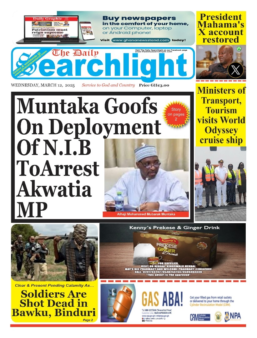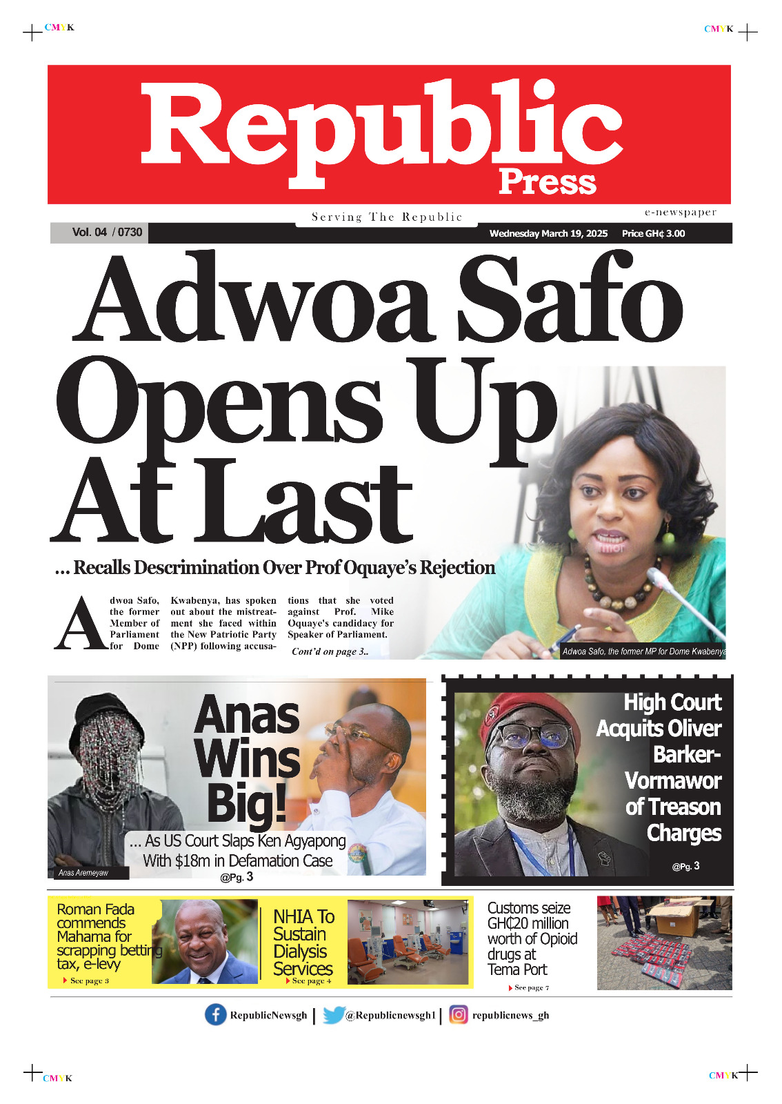 Headlines of major news items, as captured on the front pages of newspapers. <a href="https://myrepubliconline.com/newspaper-headlines-wednesday-march-19-2025/rep-4/" rel="attachment wp-att-110762"><img class="alignnone size-full wp-image-110762" src="https://myrepubliconline.com/wp-content/uploads/2025/03/Rep.jpeg" alt="" width="1134" height="1600" /></a> https://online.flippingbook.com/link/993145/ https://myrepubliconline.com/wp-content/uploads/2025/03/RP-M19.pdf <a href="https://myrepubliconline.com/newspaper-headlines-wednesday-march-19-2025/graphic-67/" rel="attachment wp-att-110766"><img class="alignnone size-full wp-image-110766" src="https://myrepubliconline.com/wp-content/uploads/2025/03/graphic-7.jpg" alt="" width="1000" height="1318" /></a><a href="https://myrepubliconline.com/newspaper-headlines-wednesday-march-19-2025/img-20250319-wa00026177741416174500242/" rel="attachment wp-att-110779"><img class="alignnone size-full wp-image-110779" src="https://myrepubliconline.com/wp-content/uploads/2025/03/img-20250319-wa00026177741416174500242.jpg" alt="" width="511" height="656" /></a><a href="https://myrepubliconline.com/newspaper-headlines-wednesday-march-19-2025/img-20250319-wa00056995666645932031179/" rel="attachment wp-att-110780"><img class="alignnone size-full wp-image-110780" src="https://myrepubliconline.com/wp-content/uploads/2025/03/img-20250319-wa00056995666645932031179.jpg" alt="" width="520" height="648" /></a><a href="https://myrepubliconline.com/newspaper-headlines-wednesday-march-19-2025/img-20250319-wa00005868645744018254971/" rel="attachment wp-att-110781"><img class="alignnone size-full wp-image-110781" src="https://myrepubliconline.com/wp-content/uploads/2025/03/img-20250319-wa00005868645744018254971.jpg" alt="" width="522" height="648" /></a><a href="https://myrepubliconline.com/newspaper-headlines-wednesday-march-19-2025/img-20250319-wa00065003858131952988228/" rel="attachment wp-att-110782"><img class="alignnone size-full wp-image-110782" src="https://myrepubliconline.com/wp-content/uploads/2025/03/img-20250319-wa00065003858131952988228.jpg" alt="" width="505" height="648" /></a><a href="https://myrepubliconline.com/newspaper-headlines-wednesday-march-19-2025/img-20250319-wa00046187883855712941020/" rel="attachment wp-att-110783"><img class="alignnone size-full wp-image-110783" src="https://myrepubliconline.com/wp-content/uploads/2025/03/img-20250319-wa00046187883855712941020.jpg" alt="" width="460" height="552" /></a><a href="https://myrepubliconline.com/newspaper-headlines-wednesday-march-19-2025/img-20250319-wa00038843824940219655974/" rel="attachment wp-att-110784"><img class="alignnone size-full wp-image-110784" src="https://myrepubliconline.com/wp-content/uploads/2025/03/img-20250319-wa00038843824940219655974.jpg" alt="" width="484" height="648" /></a><a href="https://myrepubliconline.com/newspaper-headlines-wednesday-march-19-2025/img-20250319-wa0001753284483356677686/" rel="attachment wp-att-110785"><img class="alignnone size-full wp-image-110785" src="https://myrepubliconline.com/wp-content/uploads/2025/03/img-20250319-wa0001753284483356677686.jpg" alt="" width="484" height="648" /></a><a href="https://myrepubliconline.com/newspaper-headlines-wednesday-march-19-2025/img-20250319-wa00078741352788456035429/" rel="attachment wp-att-110786"><img class="alignnone size-full wp-image-110786" src="https://myrepubliconline.com/wp-content/uploads/2025/03/img-20250319-wa00078741352788456035429.jpg" alt="" width="484" height="648" /></a><a href="https://myrepubliconline.com/newspaper-headlines-wednesday-march-19-2025/analyst-monday-2-6/" rel="attachment wp-att-110773"><img class="alignnone size-full wp-image-110773" src="https://myrepubliconline.com/wp-content/uploads/2025/03/Analyst-Monday-2.jpg" alt="" width="778" height="1056" /></a><a href="https://myrepubliconline.com/newspaper-headlines-wednesday-march-19-2025/daily-searchlight-wednesday-printed-1/" rel="attachment wp-att-110775"><img class="alignnone size-full wp-image-110775" src="https://myrepubliconline.com/wp-content/uploads/2025/03/Daily-Searchlight-Wednesday-Printed-1.jpg" alt="" width="822" height="1080" /></a><a href="https://myrepubliconline.com/newspaper-headlines-wednesday-march-19-2025/informer-28/" rel="attachment wp-att-110777"><img class="alignnone size-full wp-image-110777" src="https://myrepubliconline.com/wp-content/uploads/2025/03/informer-4.jpg" alt="" width="958" height="1280" /></a><a href="https://myrepubliconline.com/newspaper-headlines-wednesday-march-19-2025/img-20250319-wa0012/" rel="attachment wp-att-110788"><img class="alignnone size-full wp-image-110788" src="https://myrepubliconline.com/wp-content/uploads/2025/03/IMG-20250319-WA0012.jpg" alt="" width="899" height="1280" /></a><a href="https://myrepubliconline.com/newspaper-headlines-wednesday-march-19-2025/img-20250319-wa0011/" rel="attachment wp-att-110789"><img class="alignnone size-full wp-image-110789" src="https://myrepubliconline.com/wp-content/uploads/2025/03/IMG-20250319-WA0011.jpg" alt="" width="817" height="1080" /></a><a href="https://myrepubliconline.com/newspaper-headlines-wednesday-march-19-2025/ghanaian-guide-8/" rel="attachment wp-att-110776"><img class="alignnone size-full wp-image-110776" src="https://myrepubliconline.com/wp-content/uploads/2025/03/Ghanaian-Guide-3.jpg" alt="" width="720" height="938" /></a><a href="https://myrepubliconline.com/newspaper-headlines-wednesday-march-19-2025/bft-28/" rel="attachment wp-att-110774"><img class="alignnone size-full wp-image-110774" src="https://myrepubliconline.com/wp-content/uploads/2025/03/BFT-6.jpeg" alt="" width="768" height="1080" /></a><a href="https://myrepubliconline.com/newspaper-headlines-wednesday-march-19-2025/radar/" rel="attachment wp-att-110768"><img class="alignnone size-full wp-image-110768" src="https://myrepubliconline.com/wp-content/uploads/2025/03/radar.jpeg" alt="" width="1137" height="1600" /></a><a href="https://myrepubliconline.com/newspa