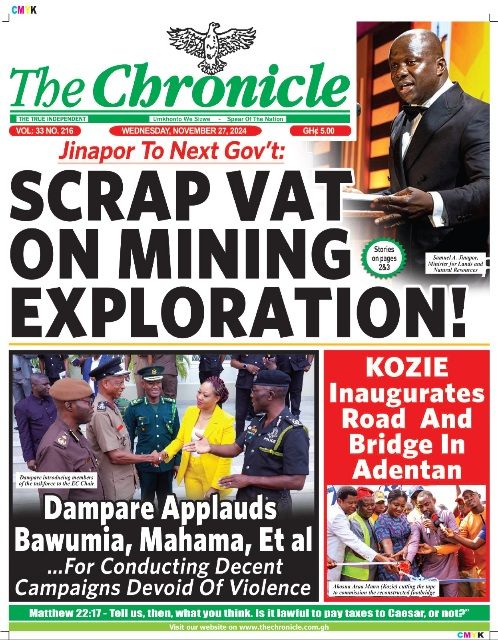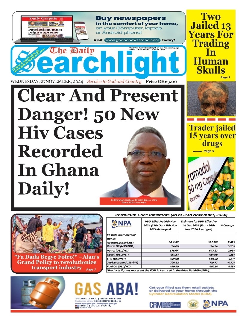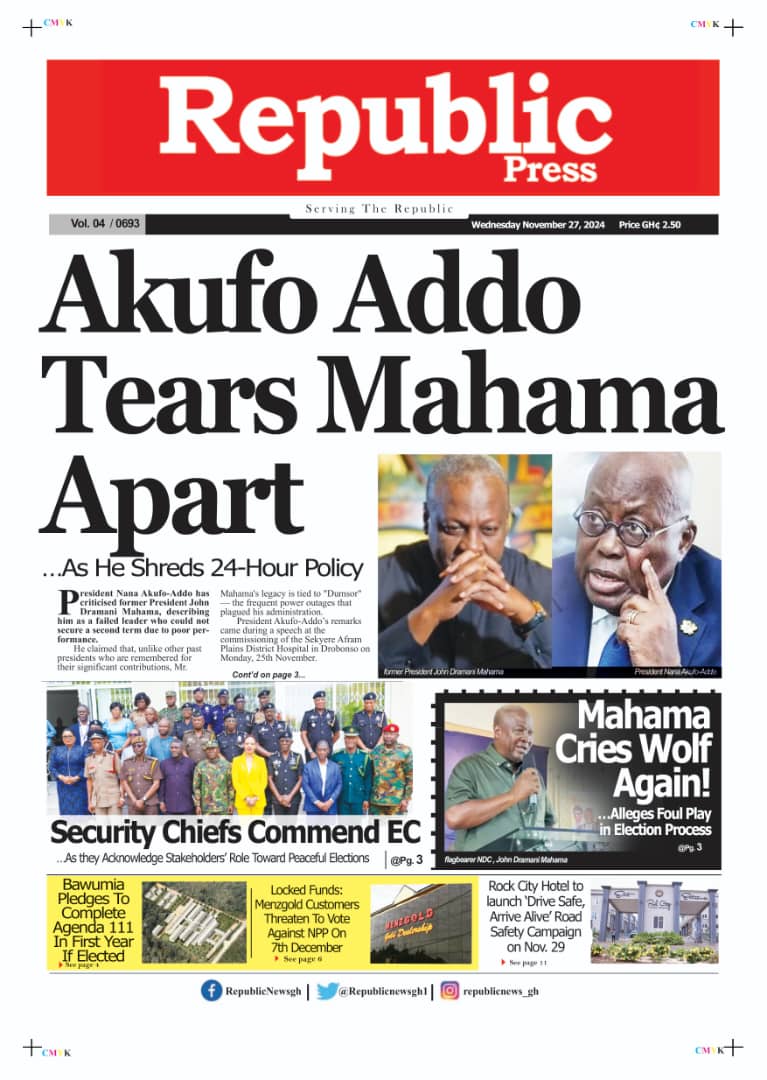 Headlines of major news items, as captured on the front pages of newspapers. <a href="https://myrepubliconline.com/newspaper-headlines-wednesday-november-27-2024/republic-3/" rel="attachment wp-att-103833"><img class="alignnone size-full wp-image-103833" src="https://myrepubliconline.com/wp-content/uploads/2024/11/Republic.jpeg" alt="" width="767" height="1080" /></a><a href="https://myrepubliconline.com/newspaper-headlines-wednesday-november-27-2024/w1uxsfbvnmrpoz3dq7wn7sgfzuaa05obefojskuw-thumbnail/" rel="attachment wp-att-103834"><img class="alignnone size-full wp-image-103834" src="https://myrepubliconline.com/wp-content/uploads/2024/11/w1UxSfbvnmRpOZ3DQ7Wn7sGfZuaa05oBeFojskuW-thumbnail.jpg" alt="" width="1000" height="1318" /></a> <a href="https://myrepubliconline.com/newspaper-headlines-wednesday-november-27-2024/zsyolq0c3zp2lfzmtart6ivcyvtxhmbhocjxtdzm-thumbnail/" rel="attachment wp-att-103835"><img class="alignnone size-full wp-image-103835" src="https://myrepubliconline.com/wp-content/uploads/2024/11/ZSYOlq0c3Zp2lfzmtArT6ivcyvTXhMBHocJxTdzM-thumbnail.jpg" alt="" width="1000" height="1318" /></a><a href="https://myrepubliconline.com/newspaper-headlines-wednesday-november-27-2024/analyst-wednesday-3-4/" rel="attachment wp-att-103839"><img class="alignnone size-full wp-image-103839" src="https://myrepubliconline.com/wp-content/uploads/2024/11/Analyst-wednesday-3-1.jpg" alt="" width="778" height="1056" /></a><a href="https://myrepubliconline.com/newspaper-headlines-wednesday-november-27-2024/daily-searchlight-wednesday-printed-3/" rel="attachment wp-att-103840"><img class="alignnone size-full wp-image-103840" src="https://myrepubliconline.com/wp-content/uploads/2024/11/Daily-Searchlight-Wednesday-Printed-3.jpg" alt="" width="822" height="1080" /></a><a href="https://myrepubliconline.com/newspaper-headlines-wednesday-november-27-2024/go-wednesday-2/" rel="attachment wp-att-103841"><img class="alignnone size-full wp-image-103841" src="https://myrepubliconline.com/wp-content/uploads/2024/11/go-Wednesday-2.jpg" alt="" width="1177" height="1600" /></a><a href="https://myrepubliconline.com/newspaper-headlines-wednesday-november-27-2024/informer-wednesday-3-696x930/" rel="attachment wp-att-103842"><img class="alignnone size-full wp-image-103842" src="https://myrepubliconline.com/wp-content/uploads/2024/11/Informer-Wednesday-3-696x930-1.jpg" alt="" width="696" height="930" /></a><a href="https://myrepubliconline.com/newspaper-headlines-wednesday-november-27-2024/news-centa1571543901642719545/" rel="attachment wp-att-103844"><img class="alignnone size-full wp-image-103844" src="https://myrepubliconline.com/wp-content/uploads/2024/11/news-centa1571543901642719545.jpg" alt="" width="484" height="648" /></a><a href="https://myrepubliconline.com/newspaper-headlines-wednesday-november-27-2024/trust3295217270633419319/" rel="attachment wp-att-103845"><img class="alignnone size-full wp-image-103845" src="https://myrepubliconline.com/wp-content/uploads/2024/11/trust3295217270633419319.jpg" alt="" width="560" height="648" /></a><a href="https://myrepubliconline.com/newspaper-headlines-wednesday-november-27-2024/img_20241127_0539294994483644079262958/" rel="attachment wp-att-103846"><img class="alignnone size-full wp-image-103846" src="https://myrepubliconline.com/wp-content/uploads/2024/11/img_20241127_0539294994483644079262958.jpg" alt="" width="510" height="650" /></a><a href="https://myrepubliconline.com/newspaper-headlines-wednesday-november-27-2024/accra-times3589692839065929137/" rel="attachment wp-att-103847"><img class="alignnone size-full wp-image-103847" src="https://myrepubliconline.com/wp-content/uploads/2024/11/accra-times3589692839065929137.jpg" alt="" width="520" height="648" /></a><a href="https://myrepubliconline.com/newspaper-headlines-wednesday-november-27-2024/despatch3854739038302667540/" rel="attachment wp-att-103848"><img class="alignnone size-full wp-image-103848" src="https://myrepubliconline.com/wp-content/uploads/2024/11/despatch3854739038302667540.jpg" alt="" width="522" height="648" /></a><a href="https://myrepubliconline.com/newspaper-headlines-wednesday-november-27-2024/custodian6548455320085625612/" rel="attachment wp-att-103849"><img class="alignnone size-full wp-image-103849" src="https://myrepubliconline.com/wp-content/uploads/2024/11/custodian6548455320085625612.jpg" alt="" width="520" height="648" /></a><a href="https://myrepubliconline.com/newspaper-headlines-wednesday-november-27-2024/chronicle1845424328458644752/" rel="attachment wp-att-103850"><img class="alignnone size-full wp-image-103850" src="https://myrepubliconline.com/wp-content/uploads/2024/11/chronicle1845424328458644752.jpg" alt="" width="498" height="640" /></a><a href="https://myrepubliconline.com/newspaper-headlines-wednesday-november-27-2024/daily4758473503296935898/" rel="attachment wp-att-103851"><img class="alignnone size-full wp-image-103851" src="https://myrepubliconline.com/wp-content/uploads/2024/11/daily4758473503296935898.jpg" alt="" width="478" height="640" /></a><a href="https://myrepubliconline.com/newspaper-headlines-wednesday-november-27-2024/ghanaian-publisher4722111572080310690/" rel="attachment wp-att-103852"><img class="alignnone size-full wp-image-103852" src="https://myrepubliconline.com/wp-content/uploads/2024/11/ghanaian-publisher4722111572080310690.jpg" alt="" width="484" height="648" /></a>