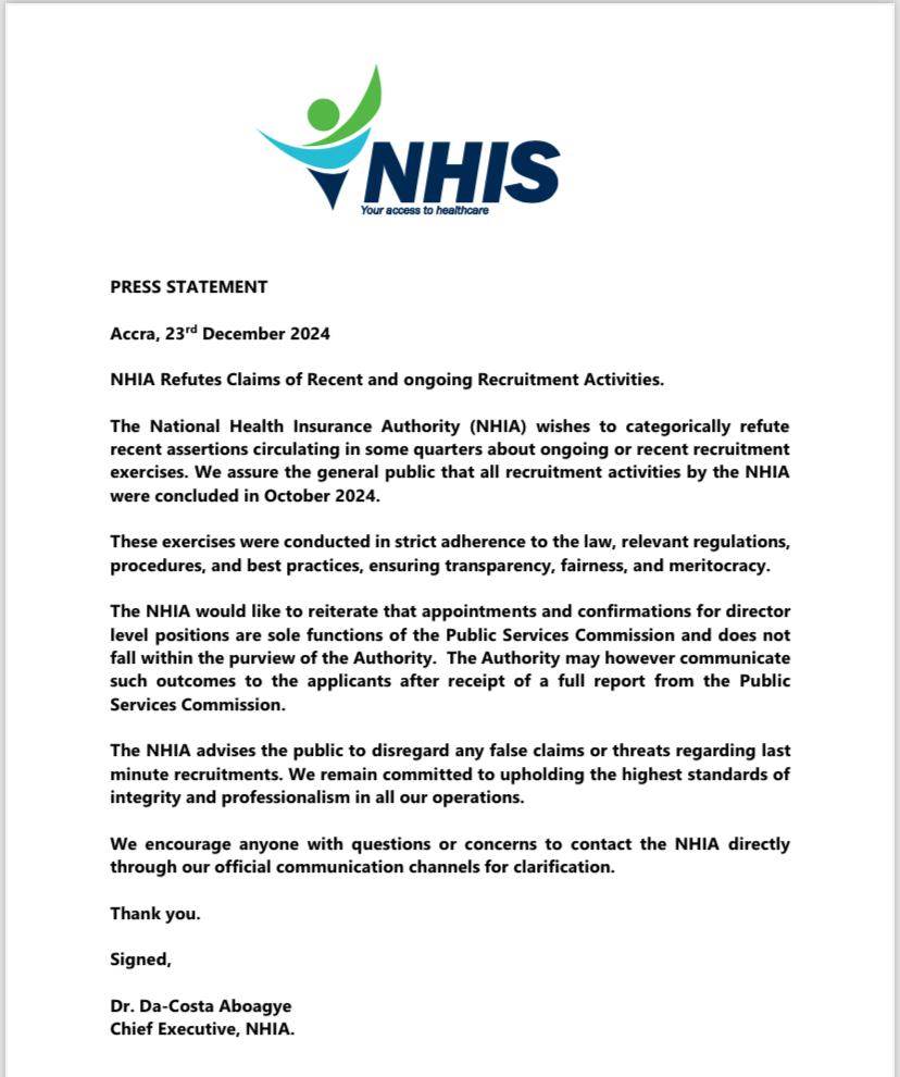 Signed by Dr. Da-Costa Aboagye, Chief Executive of the NHIA, the statement concluded by thanking the public for their understanding and cooperation.
