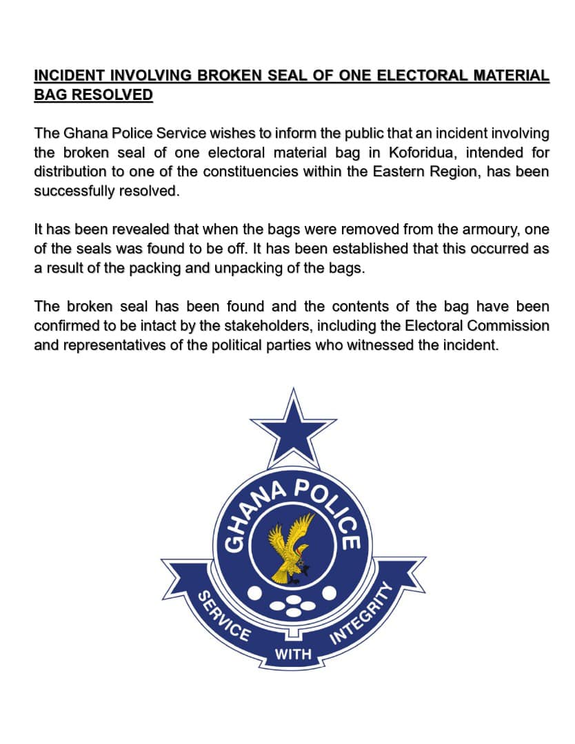 The Ghana Police Service has confirmed the resolution of an incident involving the broken seal of an electoral material bag in Koforidua, Eastern Region.