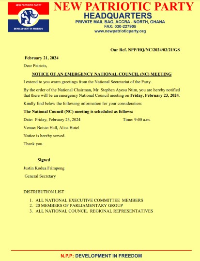 “I extend to you warm greetings from the National Secretariat of the Party. By the order of the National Chairman, Mr. Stephen Ayesu Ntim, you are hereby notified that there will be an emergency National Council meeting on Friday, February 23, 2024.”