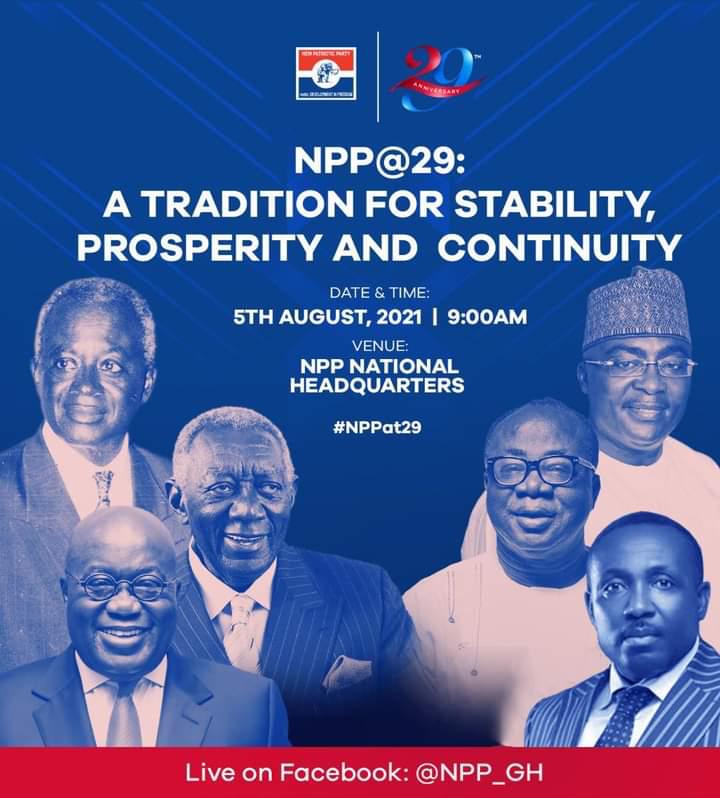 The New Patriotic Party (NPP) will celebrate 29 years of the Party on Thursday, 5th August, 2021 at 9am at the Party Headquarters in Asylum Down.