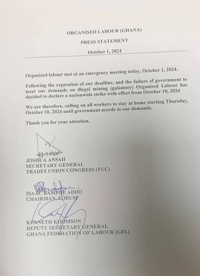 Organized Labour has announced a nationwide strike starting on October 10, 2024, in response to the government’s failure to meet their demands regarding the issue of illegal mining, also known as galamsey.
