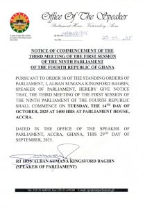 In a notice issued by the Speaker, Alban Bagbin, the House is expected to commence business at 2:00 pm at Parliament House in Accra.
