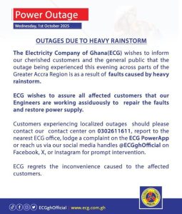 The Electricity Company of Ghana (ECG) has reported power outages in parts of the Greater Accra Region following a heavy rainstorm on Wednesday.