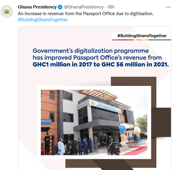 “Governments digitization programme has improved passport offices revenues from ¢1million cedis in 2017 to ¢56 million in 2021,” a tweet by the Presidency said.