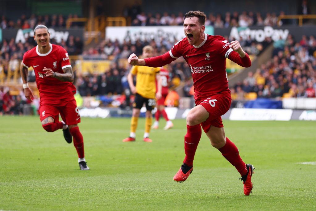 Andy Robertson marked his 200th Premier League appearance by putting the Reds ahead for the first time on 85 minutes, before substitute Harvey Elliott’s shot deflected off Hugo Bueno for an own goal to seal the victory in stoppage time.