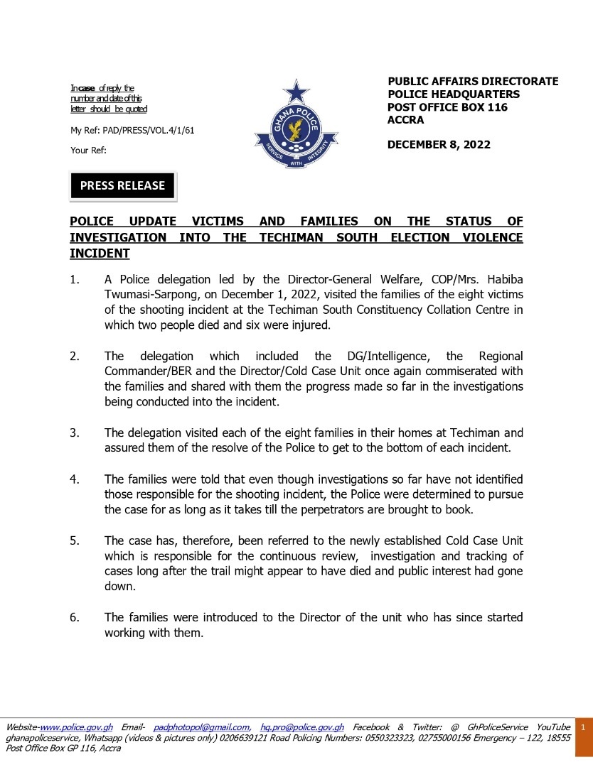 “The delegation visited each of the eight families in their homes at Techiman and assured them of the resolve of the police to get to the bottom of each incident.