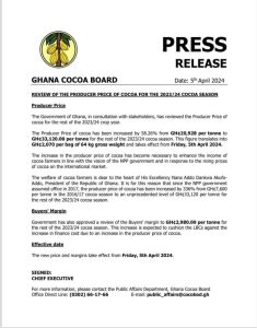 The Ghana Cocoa Board (COCOBOD) has announced an increase in producer price of cocoa for the 2023/2024 crop year, effective April 5.