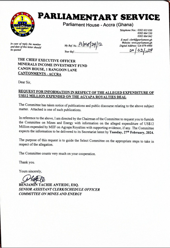 The Mines and Energy Committee in Parliament has issued a seven-day ultimatum to the Chief Executive Officer of the Minerals Income Investment Fund (MIIF), Edward Nana Yaw Koranteng, to provide the Committee with further details regarding the $12 million spent on the botched Agyapa royalties deal.