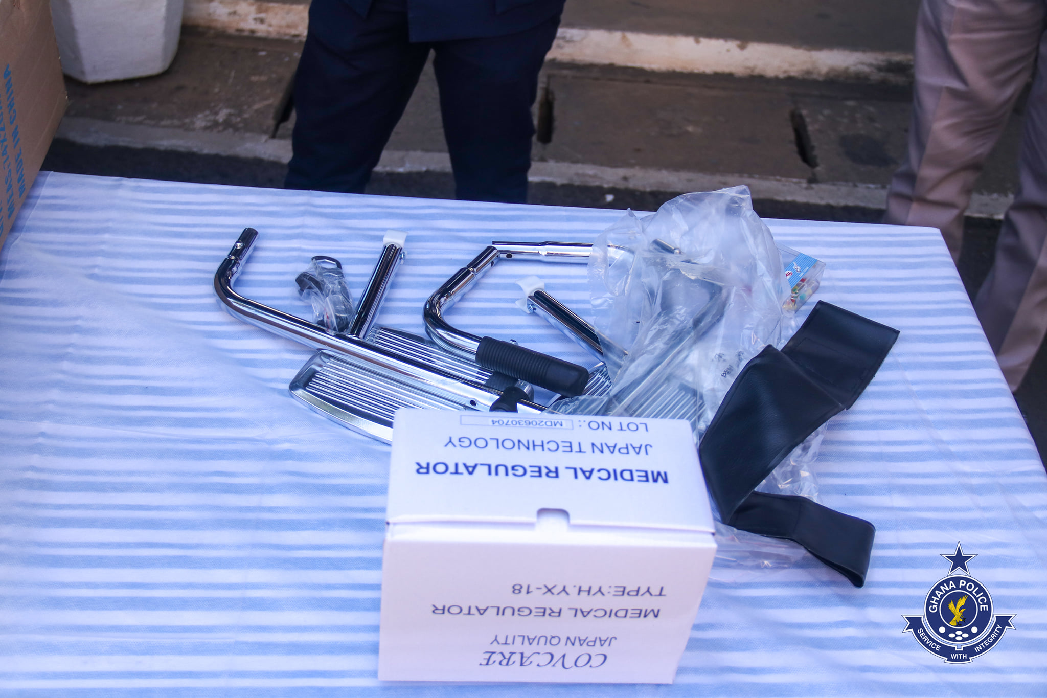 The equipment include five (5) filled large 47.2 Kg Oxygen cylinders, three (3) Medical Regulators, Four (4) Wheelchairs and eleven (11) Crutches.