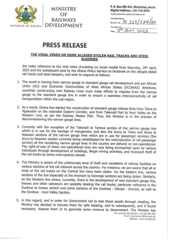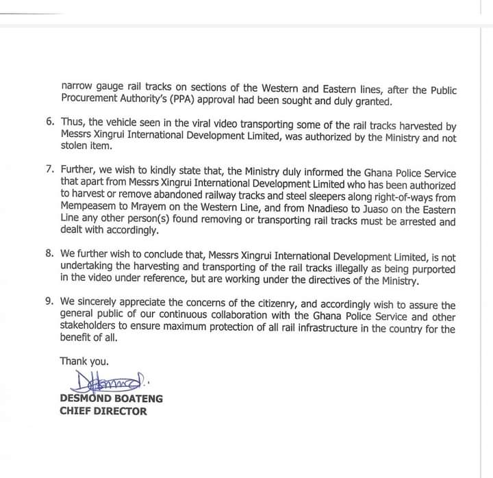 “Further, we wish to kindly state that, the Ministry duly informed the Ghana Police Service that apart from Messrs Xingrui International Development Limited who has been authorized to remove abandoned railway tracks and steel sleepers along right-of-ways from Mempeasem to Mrayem on the Western Line, and from Nnadieso to Juaso on the Eastern Line, any other person(s) found removing or transporting rail tracks must be arrested and dealt with accordingly.