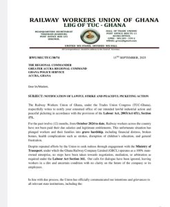The Railway Workers Union of Ghana has announced plans for a strike and picketing on September 30, 2025, if the Ghana Railway Company Limited fails to pay 12 months of salary arrears dating back to October 2024.
