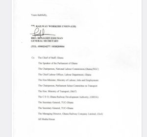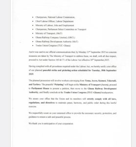 The notice was copied to the National Labour Commission, Ministry of Labour, Jobs and Employment, Ghana Railway Development Authority, Trades Union Congress, and Parliament’s Select Committee on Transport. The union warned that if no concrete action is taken by September 22, 2025, it will invoke Sections 160 and 171 of the Labour Act to enforce its rights.