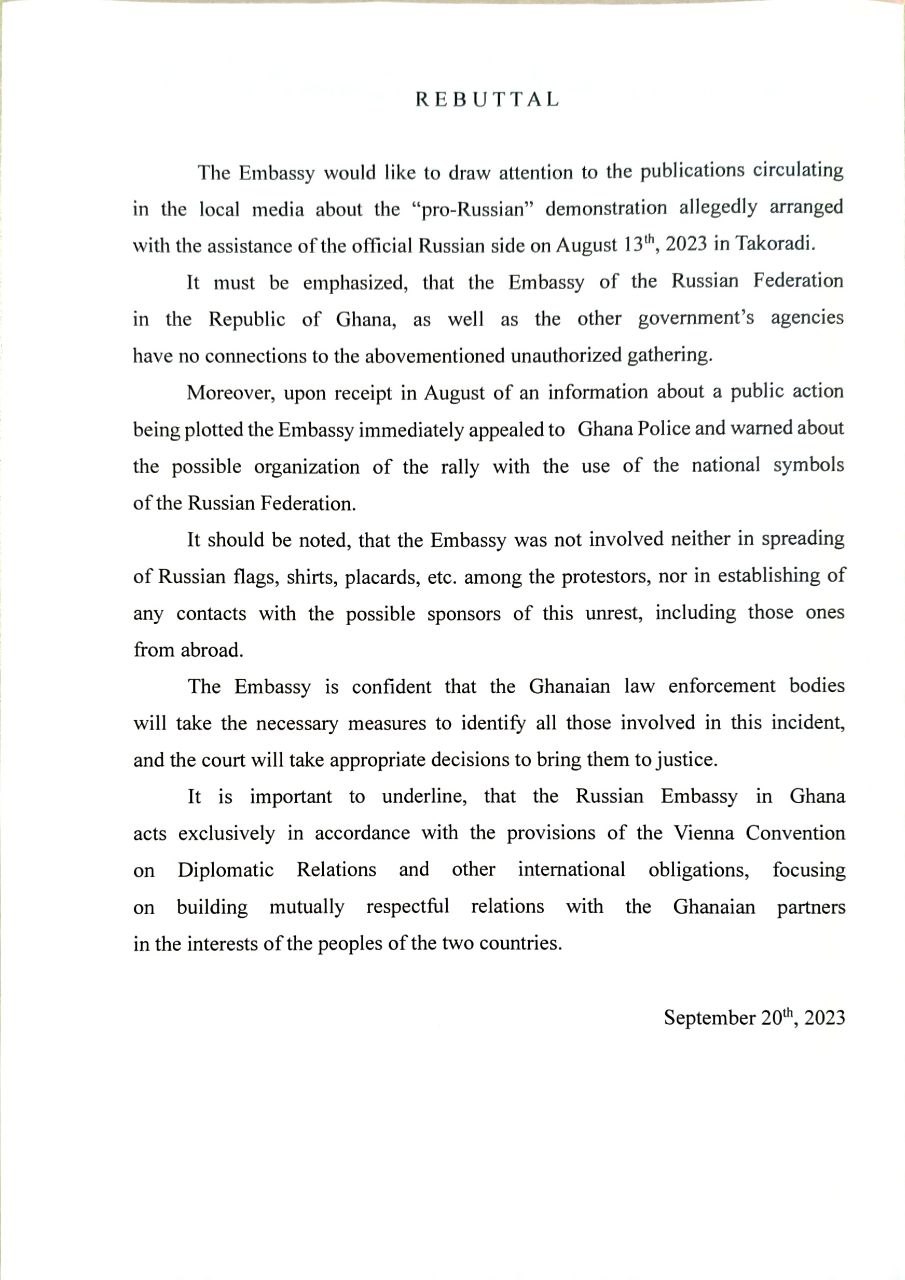 “It must be emphasized that the Embassy of the Russian Federation in the Republic of Ghana, as well as the other government agencies, have no connections to the above mentioned unauthorized gathering,” part of the statement read.