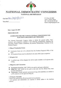 The National Democratic Congress (NDC) has announced guidelines for its parliamentary primaries ahead of the by-election in the Tamale Central Constituency in the Northern Region.