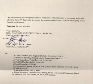 The Teachers and Educational Workers’ Union (TEWU) of the Trades Union Congress (TUC) has announced an industrial action effective Thursday, September 19, 2025, citing delays in finalizing and signing Conditions of Service agreements.