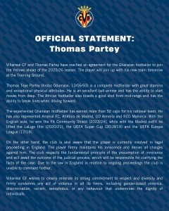 Spanish La Liga outfit Villarreal has officially announced the signing of Ghana midfielder Thomas Partey on a two-year contract ahead of the 2025/26 season.