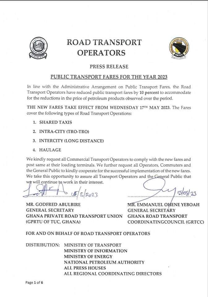 In a statement, the road transport operators say the reduction affects shared taxis, intra-city (trotro), intercity (long distance) and haulage.