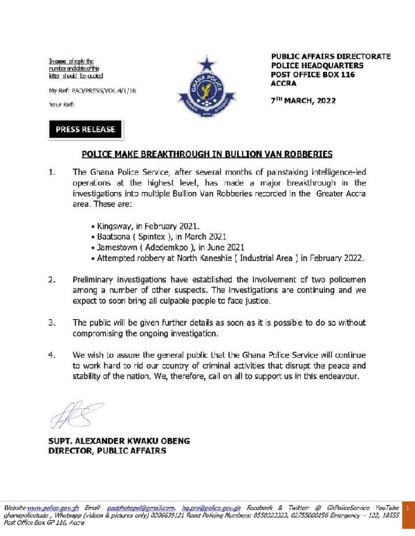 “The Ghana Police Service, after several months of painstaking intelligence-led operations at the highest level, has made a major breakthrough in the investigations into multiple Bullion Van Robberies recorded in the Greater Accra area.