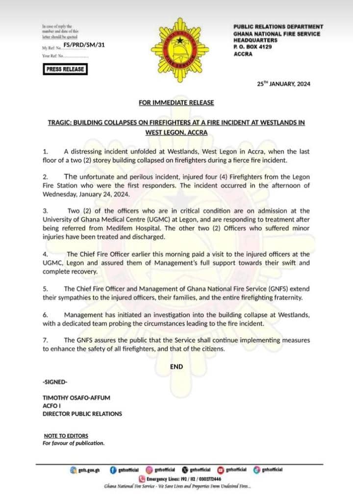 The statement further noted that, the Chief Fire Officer earlier this morning paid a visit to the injured officers at the UGMC, Legon and assured them of Management’s full support towards their swift and complete recovery adding that investigations have began into the collapse of the building and the cause of the fire.