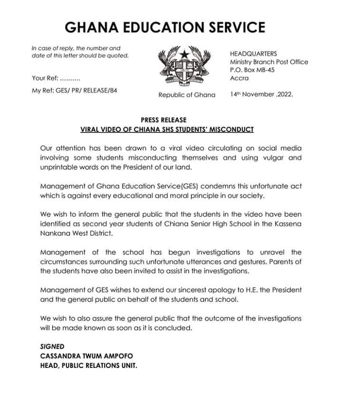 Management of GES also apologized to the President and the general public on behalf of the school and the students.
