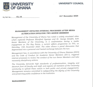 In a statement, the University said management has taken note of the incident and, in line with the University of Ghana Statutes (2024) and the Code of Conduct for Academic Senior Members (2011), has activated internal procedures to review the conduct of both academics and determine appropriate disciplinary measures.
