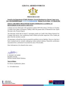 The Ghana Armed Forces (GAF), has confirmed that its helicopter with registration number GHF 696 was involved in an emergency landing on Tuesday, March 19, 2024 at Bonsukrom near Agona Nkwanta in the Western Region of Ghana.