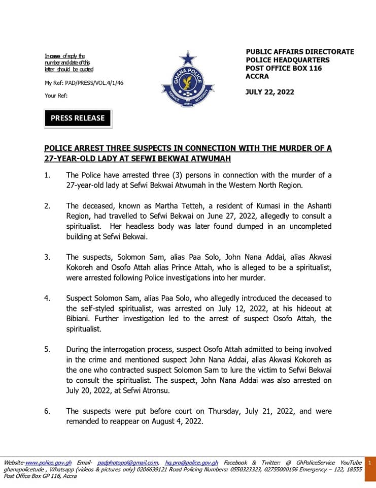 “During the interrogation process, suspect Osofo Attah admitted to being involved in the crime and mentioned suspect John Nana Addai, alias Akwasi Kokoreh as the one who contracted suspect Solomon Sam to lure the victim to Sefwi Bekwai to consult the spiritualist,” the police said in a statement on Friday, July 22.