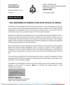 A release dated August 21, signed by ASP Beatrice Turkson, Head of Public Affairs for the region, confirmed that both suspects were arrested on August 9, 2025, from separate hideouts.
