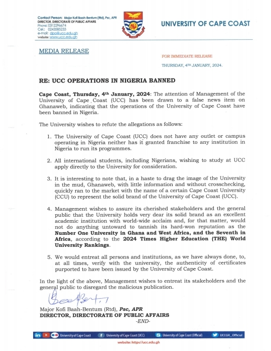 However, a statement signed by Director of Public Affairs of the university, Major Kofi Baah-Bentum (Rtd), stated that “The University of Cape Coast (UCC) does not have any outlet or campus operating in Nigeria neither has it granted franchise to any institution in Nigeria to run its programmes.