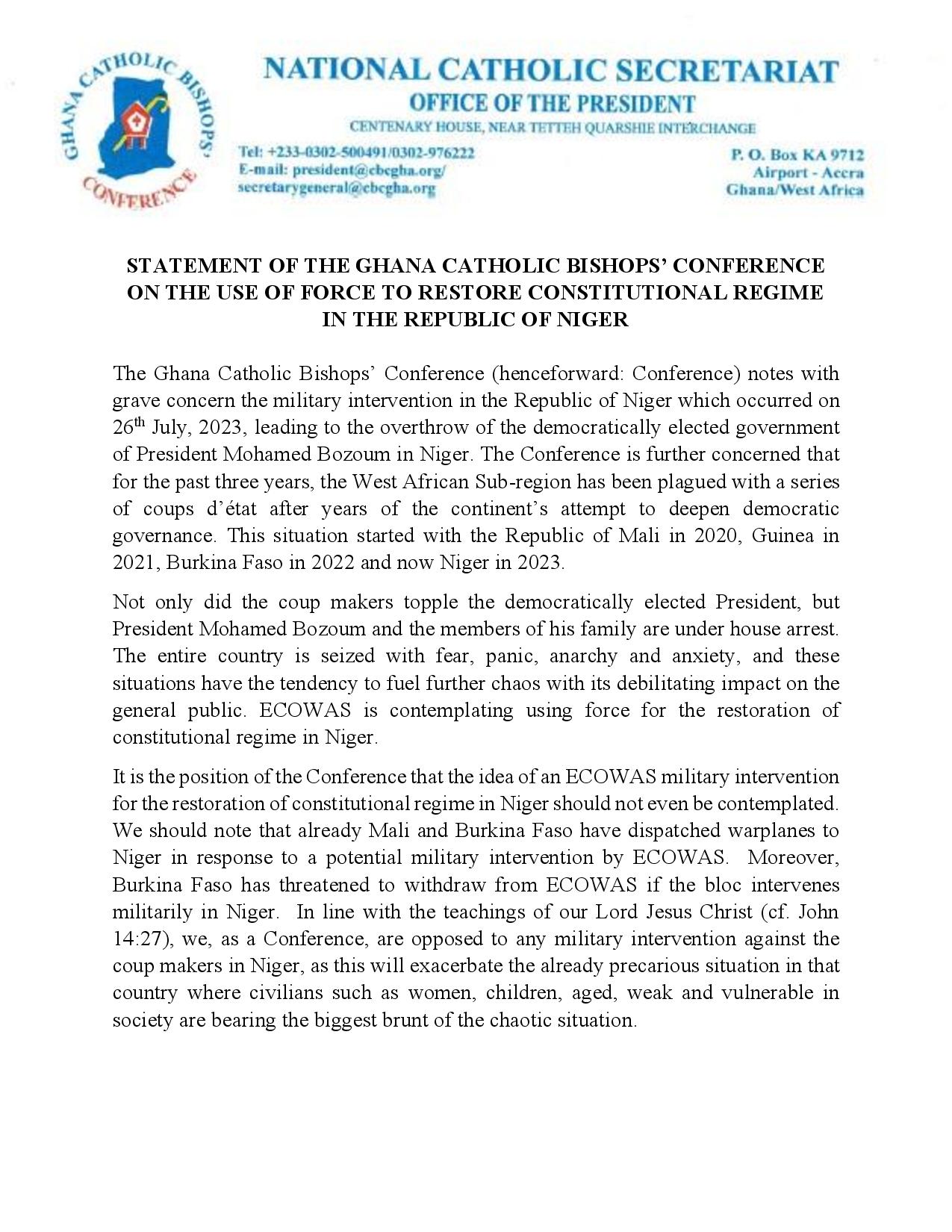 The Catholic Bishops’ Conference of Ghana have rejected any move by Economic Community of West African States (ECOWAS), to use military force to restore ousted president Mohamed Bazoum of Niger.