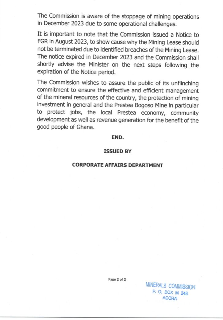 In a statement dated January 30, 2024, the Minerals Commission said it has come to its attention that FGR, operators of the Prestea-Bogoso mines made a verbal presentation to the Ministry of Lands and Natural Resources to put the mine under care and maintenance.