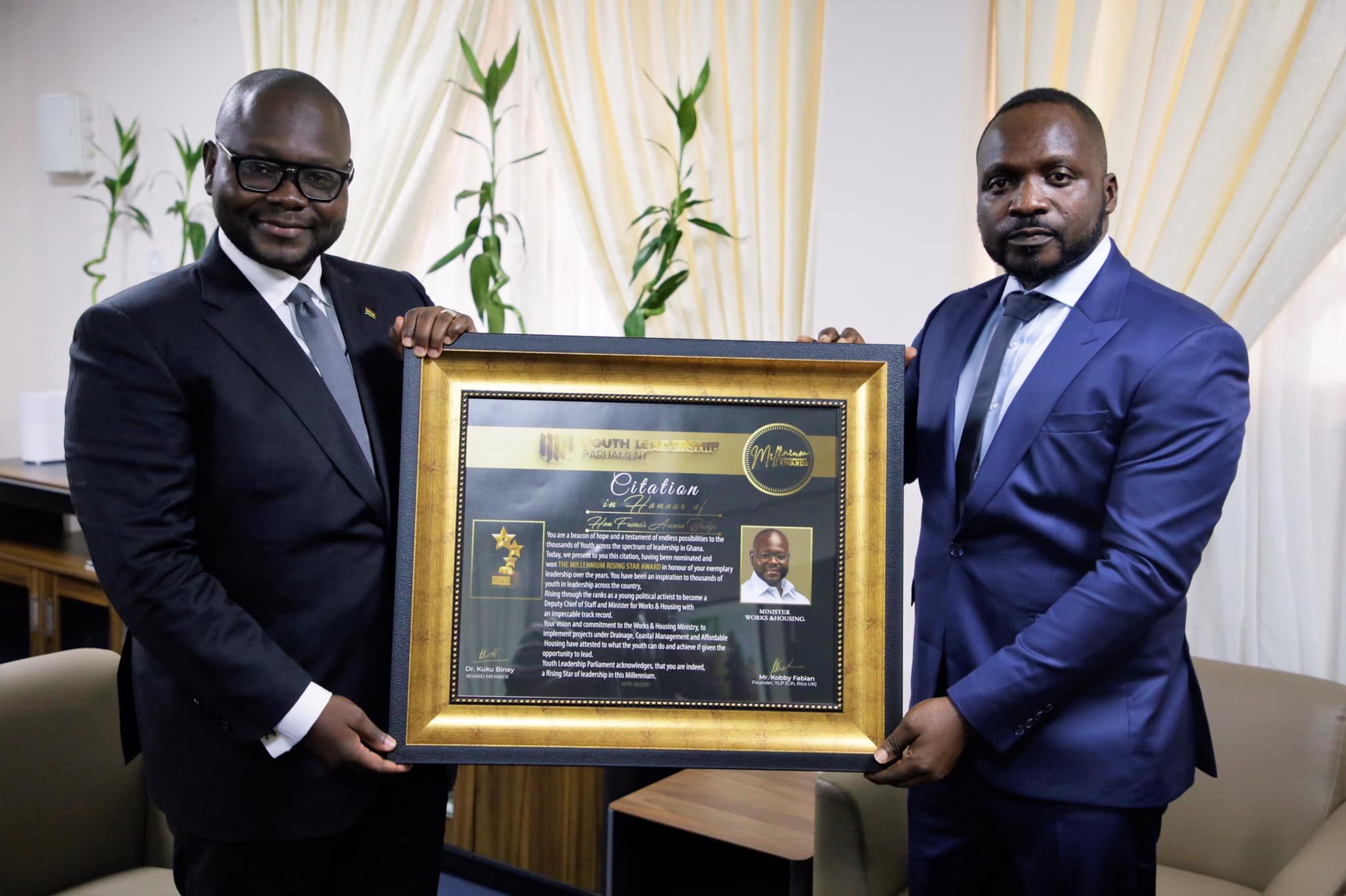 The Minister for Works and Housing, Hon. Francis Asenso-Boakye has been honoured with ‘The Rising Star Award’ by the Youth Leadership Parliament of Ghana under its initiative of the Millennium Impact Awards today in his office in Accra.