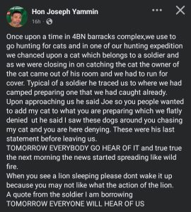 In a cryptic message posted on his official Facebook page, Dr. Yammin recalled a story from his time at the 4BN Barracks, alluding to a warning and promising, “Tomorrow everyone will hear from us.”